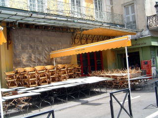 しかたがないので夕食を摂ろうと、これもガイドブックに載っていた、法皇庁広場に面する『ル・ムータルディエール』に行きました。広場に面して、テラス席がたくさんしつらえてあります。ギャルソンに予約をしていないがいいかと聞くと、まったく構わないと言うので、広場に一番近い端の席に着きました。注文は無難にメニューにしました。メインに子羊を選ぶと5ユーロ増しだったのですが、食べたかったので羊にしました。ワインは銘柄物を頼むと恐ろしく高いので、ハウスワインのカラフ。久しぶりの本格的料理は至って美味だったのですが、まだ食べ終わっていないのにギャルソンが皿を下げようとするので、まだだと言って食い下がるのが煩わしかったです。
