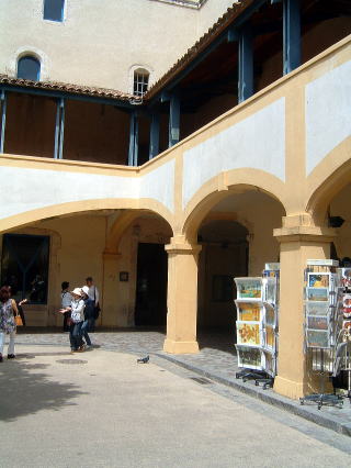 それから、法皇庁の見学。Kさんはガイドの身分証を胸になかなか決まっています。25年前来た時と同じように、もうすでに中庭には演劇祭の設備が整えられていました。昔の訪問で印象に残ったサント・カトリーヌの木像は煤けていたのがすっかりきれいに化粧直しされていました。中世に法皇がローマに帰ろうとするのを諌言して引き止めた聖女であるという由来はKさんからはじめて聞きました。Kさんは実に博学で優秀なガイドなのですが、聖書の知識に正確を欠いていたのは惜しむべき点です。