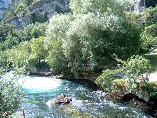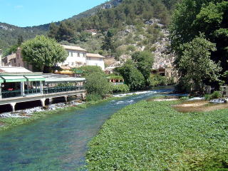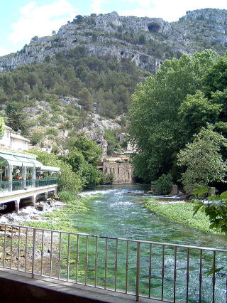 ヴォークリューズの流れ。本当に美しい。南仏の太陽に照 らされて水の色も紺碧のブルーです。 |