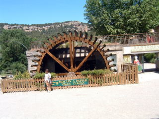 バスは文字通り細い田舎道をひた走ります。山あいに入り、フォンテーヌ・ド・ヴォークリューズに着きます。この谷川に沿った小さな村はとても素敵なところです。清冽な流れのほとりに、いかにも田舎然とした家々がならんでいます。ルネサンスの昔、トスカーナの詩人ペトラルカが訪れ愛したという素晴らしい景勝地で、オカブは今回の旅行でここが一番気に入りました。町の広場で解説を受け、川上に向かいます。流れの美しいことは画像でご覧の通り。曇っていた天気も心地よく晴れ渡って、気分も上々に南フランスの雰囲気を満喫します。ムーラン・パピエと名前のついた水車がありました。Kさんに聞いてみると、案の定、昔ここで紙を作っていたそうです。