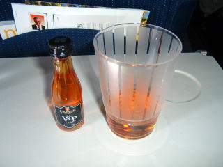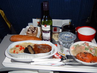 機は定刻通りに離陸。水平飛行に入ると待望の機内食。温かいお絞りの後、アペリティフ。オカブはシャンパンと意地汚くもリカールももらいました。空きっ腹に飲んだのでいい心地に酔いが回ってきたところで食事。メインはビーフの煮込みをチョイス。アントレはサーモンとひらめのカルパッチョ。赤ワインにデザートはガトー・ショコラ。うれしいことにエール・フランスのディジェスティフが復活していました。アテンダントのおっさんから薦められるままに、カミユのコニャックのミニチュア瓶を4本も空けてしまいました。