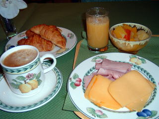 朝食はコールド・ブッフェ。ハム、チーズが中心のおかずにパン、シリアル、フルーツ、ヨーグルト、ジャム、それにコーヒーとジュースといった内容。コーヒーをゆったりと飲んでなんとかリラクゼーション。