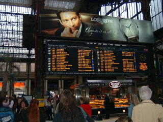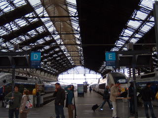 そうこうしながら無事チケットを受け取って、TGVのホームと思しきところに行ってみますがどうも勝手が違います。案内板の列車の行き先も南仏行きのものはないようです。どうもおかしいということでインフォメーションのオバハンにチケットを見せてこの列車はどこから出るんだ?と聞くと、ここではなくて、ずっとまっすぐ戻って左手に曲がりなさい、と言われました。何番線から出るのか?と聞くとどのプラットフォームから出るかは分からないとの事。どうやらTGVは発車間際にならないと、列車が何番線に入線するか分からないようです。案内板にも発車5分前くらいにならないと発車番線が表示されません。