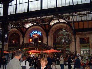 言われたとおりに構内を歩いていくと、別のTGVの発車場がありました。11:20の発車までは1時間半ほど時間があります。有名なリヨン駅の中をぶらぶらしてみたいと思いましたが、大きな荷物が邪魔になってそう気軽に散歩を楽しめるような身の回りではありません。しかたなくホームのベンチに座って時間を潰すことにしました。裏手には名高いブラッセリー『ル・トラン・ブルー』があります。残念ですが、外観を眺めただけで中を覗くことはありませんでした。