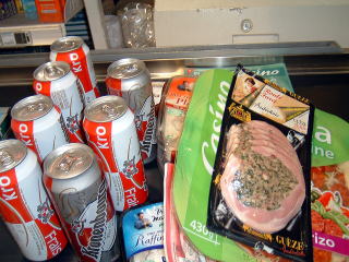 アの上に買った商品を並べる。大量のビールに注目。 |