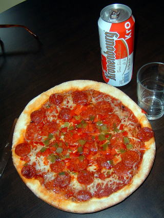 21日の夕食。焼きあがった超大型ピザとビール。シンプル