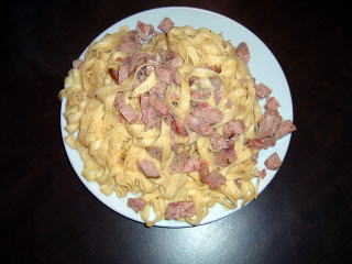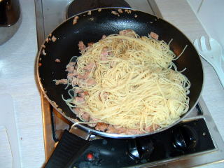 フライパンにバターをしき熱して、麺と肉を炒める。麺を茹でた