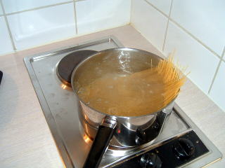 お湯を煮立たせ塩を大匙一杯入れて麺を茹でる。