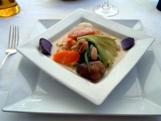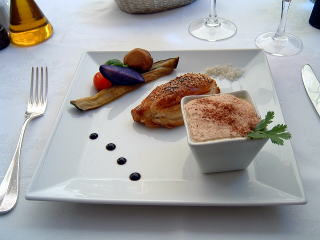 温かい前菜。エクス名物のカリソンを使っているところがプ