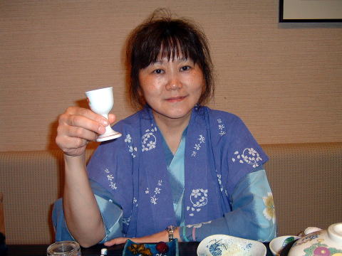 | かーたんが食前酒で乾杯。浴衣姿が艶っぽい。古女房に惚れ直す? |