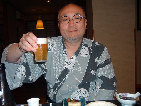 オカブが部屋に帰ると、入れ替わりにかーたんが風呂に入りにいく。もちろんオカブは浴衣に寛ぎビールである。かーたんは中国整体80分フルコース8000円也をやってくるという。まぁ、今回はかーたんの労いが目的の大半を占める旅行であるから、十分に日頃の疲れを癒して欲しい。なんといってもいつも苦労をかけている恋女房(古女房?)である。こんなささやかなことぐらいしかできないが、思い切りエンジョイしよう。こう開き直りのような気分になると格別ビールが美味い。ついつい杯も進む。座椅子に足を伸ばし、座布団を枕にして横になり、存分に寛ぐ。