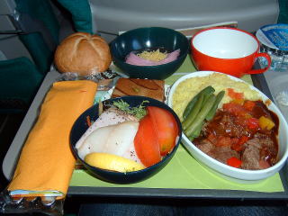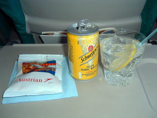 機内食はビーフと和食からビーフをチョイス。アペリティフはジン・トニック。ワインはもちろん白。オーストリア航空の食事は取り立てて美味とはいえませんが、難がなくてオカブは気に入っています。