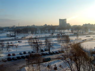 ホテルの窓から、ミンスクの冬景色。朝日に照ら