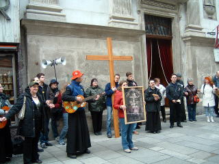 するとレントの潔斎を呼びかけるようにマルテザール教会の前で、カトリックのミッションが路傍伝道をやっていました。謹厳なウィーンのカトリックでも伝道にはソフトなムードを漂わせるようで、神父がギターでワーシップソングを弾き、会衆がそれに合わせて歌います。オカブも一緒になって歌に合わせました。なんともクリスチャンとしては嬉しい信仰の輪でした。