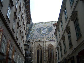 シュテファンの横の小路からシュテファンの屋根を見る。