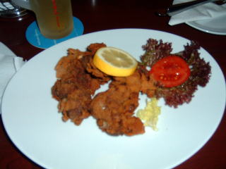 ウィンナ・シュニッツェル、グラーシュと並んだ、定番料理もありますが、前菜にターフェルシュピッツェの薄切りマリネ、それからノッケル団子入りスープ、メインに豚レバーの唐揚げをとりました。味は素朴ですが、日本人の舌にも合い、なかなか美味でした。飲み物は生ビール2杯。