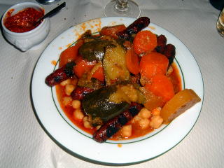やがて待ちに待ったクスクスが運ばれてきました。鉢に山盛りの引き割り小麦。でかいソーセージが二本。豆とスパイスが入った小皿。そし大瓶一杯の各種野菜の入った紅い汁。