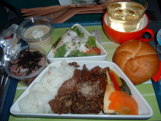 機内食。牛肉の煮込みにご飯。コールドミートのサラダ。蕎麦。