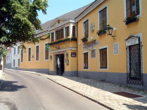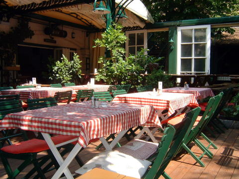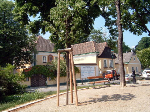 お目当てのホイリゲツム・マルティン・セップ。11:00開店とガイドブックにはあったが、11:30からだそうだ。暇つぶしに、上手にある公園の日陰のベンチに座って涼をとる。「ホイリゲ」と言うのは、葡萄酒の新酒のことを指し、ウィーン周辺の葡萄農家が、新酒の時期だけ、葡萄酒を客に飲ませても良いという皇帝の勅許を得て、始められたのが、ウィーン郊外の居酒屋、ホイリゲ。今ではグリンツィングだけでも20軒ほどのホイリゲが営業している。