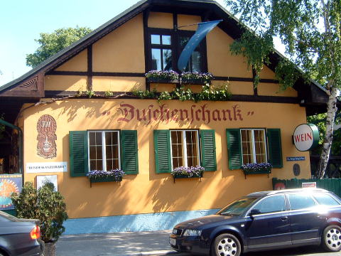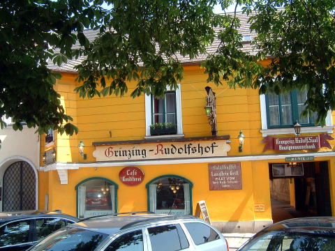 グリンツィングに戻ってホイリゲの数々。こんなホイリゲがグリンツィングに20軒以上もある。『ホイリゲ』とはオーストリアの新酒のこと。19世紀に、皇帝の勅許を持って、ウィーン近郊の葡萄酒製造農家が、新酒の季節に居酒屋を開いて公衆に飲ませてもよいというお触れが出た。そこで、こんなにたくさんのホイリゲが出来たという次第。