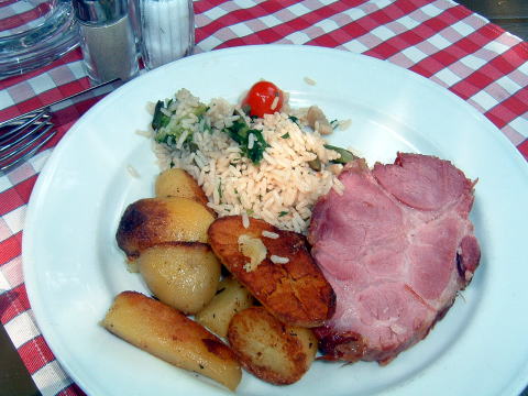 客は、オカブが入ったときには一組が、テラスの隅でチビチビやっていただけだったが、昼時となると、大勢の地元民やら観光客がなだれ込んできて大賑わい。陽気な夜のホイリゲを彷彿とさせるのであった。