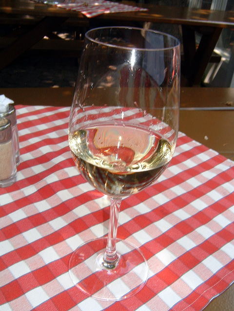 | グラスに入ったワイン。ホイリゲらしからぬのでいぶかっていると・・・ |