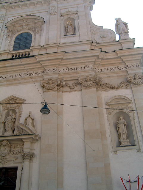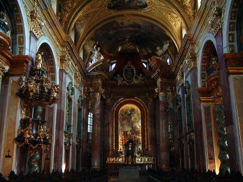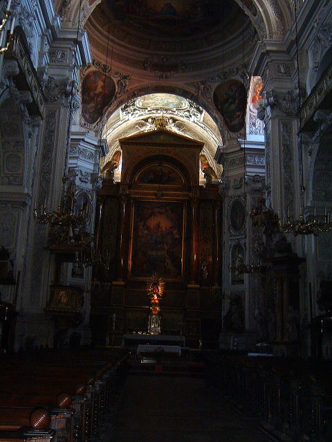 さて、イズス会教会の内部は絵に描いたようなバロック様式。見事な装飾だ。この装飾の煩わしさや、バロックのモチーフの裏側に潜む、デモーニッシュ、グロテスクな要素を嗅ぎ取って毛嫌いする人もあるようだが、オカブはこのバロックの放つ天国と地獄が並存する二元論的な美的迫力が好きだ。またバロック芸術・建築のないウィーンは本質を剥ぎ取られたようなものだ。
