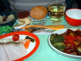 さて、お茶を飲んだにも関わらず、胃の具合が重くて、ヴァッサー・ミット・ギャスばかり飲んでいました。何回目かにギャレーに取りに行くと、「また、あなたはスパークリング・ウォーターばかり飲んで!」とアテンダントにからかわれてしまいました。