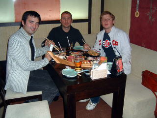 街では、やたらに、第二次大戦関連のモニュメントが目に付きます。一巡りして、カフェテリアのレストランで食事です。私はサラダにラムのシシャリック、デザートのムース、珈琲。満腹です。ガイド氏にはお礼に昼食をご馳走しました。地下鉄でデパートに行き、お土産を探そうということになりかーたんにベラルーシの民芸のペンダントを買いました。オフィスに帰り、打ち合わせの続きをしばらくして、関係者一同でディナーに行く事になりました。そこで、私が返礼のディナーのホストになることを申し出、「Планета Суши」というスシ・バーで盛り上がりました。ちなみに、この店で飲むコーラの小瓶が、2370ベラルーシ・ルーブルです。