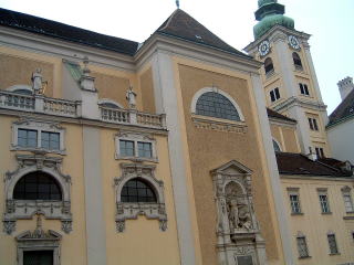 11時頃雨も上がる気配なので、オカブがウィーンで一番好きなショッテン教会に行くことにしました。シュテファンから徒歩で10分ほどの距離です。この教会はアイルランドのベネディクト会によって建てられたそうですが、内部のバロックの装飾の美しさが強く心を惹きます。このなんともいえない堂内の雰囲気を味わうために、ウィーンに来ると必ず訪れます。しかし以前は開放されていた堂内は、鉄の檻に固く閉ざされ、中に入ることができません。しかたなく檻の隙間から写真を撮って出ました。