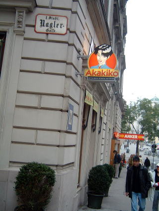 しかたなく、食事をするところを物色していると、アム・ホーフ広場とショッテン広場の間に「アカキコ」という日本料理屋を見つけました。ちょうどネットで話題になっていたので面白半分に入って見ました。ルクサス・ベントーというのとサッポロプレミアム。しめて16.7ユーロです。ベントーは、刺身、天ぷら、寿司、キムチ、ご飯などが入っており、とても食べきれないボリュームです。