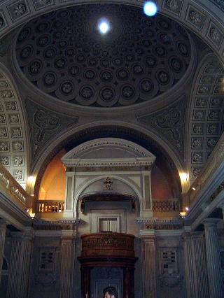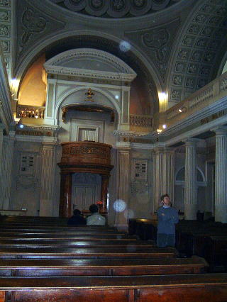 さて、日曜。きょうはできるだけたくさんのミサに列しようと考えています。それとプロテスタント教会の礼拝も守るつもりです。しかし、シュテファンの朝のミサに一回と、ドロテア・ガッセの改革派教会の聖日礼拝に出ただけでした。この改革派教会は、新婚旅行でかーたんと一緒に平日に訪ねて、寺男のおじさんに特別に会堂を開けてもらい見学したなつかしい教会です。バッハ・コラールのオルガン前奏とともに礼拝開始です。しかしドイツの教会だからなのか、会衆賛美はなく、2人の牧師が代わる代わる式文を読んだり説教をします。もちろん、説教の内容は分かりません。トッカータとフーガの後奏とともに礼拝終了。役員の人にことわって、会堂内の写真を撮らせてもらいました。礼拝献金は出口で会員が持つ籠に捧げます。