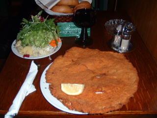 いつも日曜日の毎度のことなのですが、礼拝が終わるとお腹が空きます。初日に入り損ねた「フィグルミューラー」に行くことにします。まだ時間が早かったので、道に面したテラスの席が空いていました。この店といったらもうウィンナ・シュニッツェルです。もちろん名物のフィグルミューラー・シュニッツェルを注文しました。そしてサラダとグラスのローテワイン。シュニッツェルはなんとかだましだまし、平らげましたが、じゃがいもが大盛りのサラダはさすがに残しました。この巨大シュニッツェルの程は、下の写真でご覧あれ。