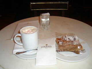 「デーメル」ではアップフェル・シュトゥルーデルとアンナ・デーメル・カフェ(オレンジリキュールの入ったメランジェ)デーメルはちょうどお茶の時間でごった返していて、1階のデーメルのシンボルともいえる調度の部屋には入れず、2階の部屋に通されました。
