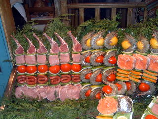 魚や海老や肉の串刺しが華やかに飾ってあるのは実に食欲をそそります。