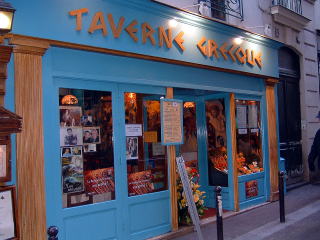 さて、昼食はサンミシェルのユシェット街でギリシア料理でも食おうと決めていたので、セーヌを左岸に渡り、サンミシェル界隈をうろつきます。ユシェット通り沿いには、似たようなギリシア料理店が軒を並べていますが、一番、お値段が手ごろで、美味そうなブロシェがショーケースに並んでいる「タヴェルナ・グレック」という店にしました。
