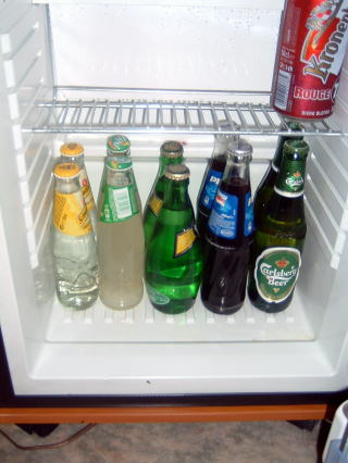 | ミニバーの中身。缶ビールの在庫が1本になってしまった! |