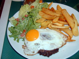 ホテルに着く前に、カフェで腹ごしらえ。目玉焼き乗せハンバーグ、11ユーロ。ボリュームたっぷりで美味かった。ついでにビールも。