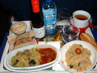 お約束の機内食ですね〜♪コールスローサラダに、